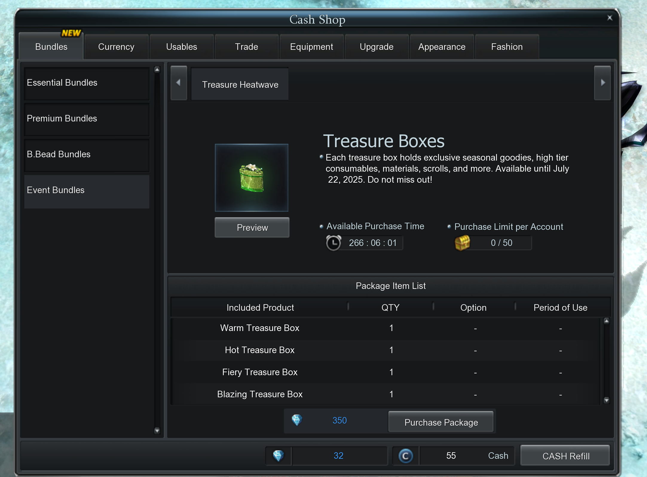 Farm dungeons, hunt bosses, and open up to 4 unique event boxes with increasing reward tiers: ๐ Warm, Hot, Fiery, and Blazing Treasure Boxes ๐ Dropped in specific dungeons based on their difficulty ...