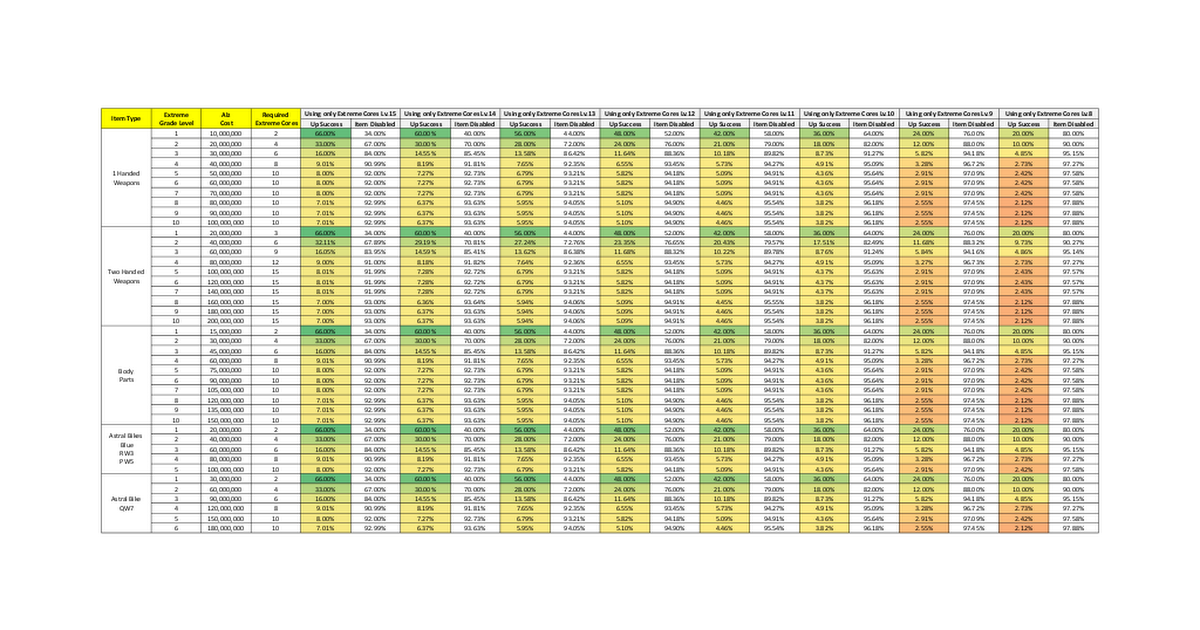 Unfortunately, during the setup, we faced too many system limitations (e.g., the maximum amount of used Extreme Cores and maximum limit of Alz used for an Extreme Upgrade attempt). That limitation leads almost to an incredible imbalance for the whole Extreme Upgrade system in the form of: